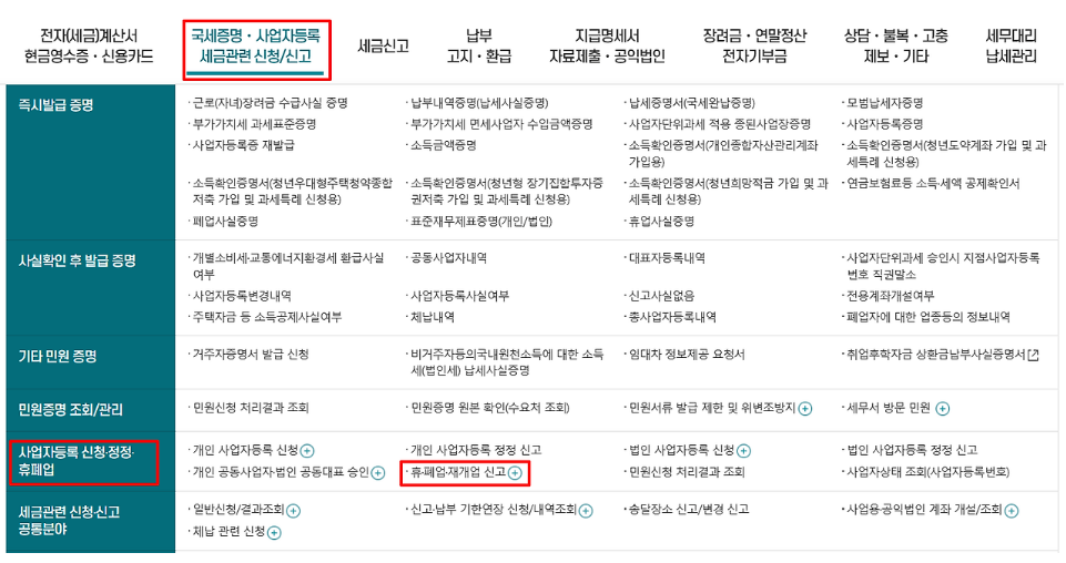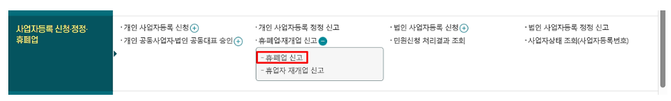 4. 사업자 등록 신청. 정정. 휴폐업 카테고리의 휴. 폐업. 재개업 신고 클릭합니다.