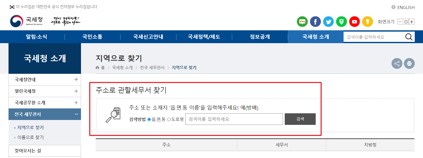 기본적으로는 주소지를 입력하여 검색하는 방법과, 직접 세무서명을 선택하여 검색하는 방법이 있습니다.