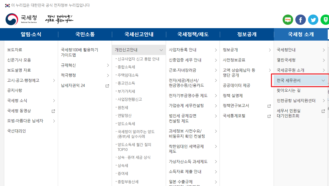 이 하위 메뉴들 중에서 '전국세무관서'라는 메뉴를 찾아 클릭해야 합니다.