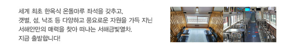 서해 금빛 열차는 대한민국 서해안의 아름다운 풍경을 감상하며 편안하게 여행할 수 있는 관광 열차입니다. 이 열차는 서울에서 출발하여 충청남도와 전라남도의 주요 도시들을 연결하며, 다양한 테마와 즐길 거리를 제공합니다. 서해안의 아름다운 바다 풍경과 함께, 여유로운 여행을 즐기고 싶다면 서해금빛 열차를 선택하시고, 온돌마루 예약 방법에 대해서 자세히 알아보도록 하겠습니다.