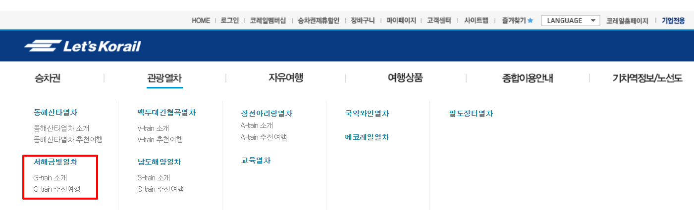 관광열차 메뉴에서 서해 골든 트레인을 찾을 수 있습니다.