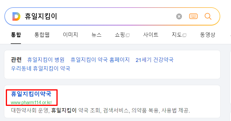 1. 검색 창에 " 휴일지킴이약국 " 을 검색합니다.