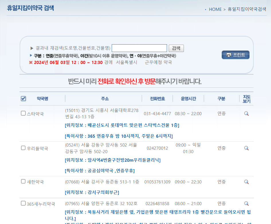 4. 조회를 하면 약국 정보를 보실 수 있습니다.