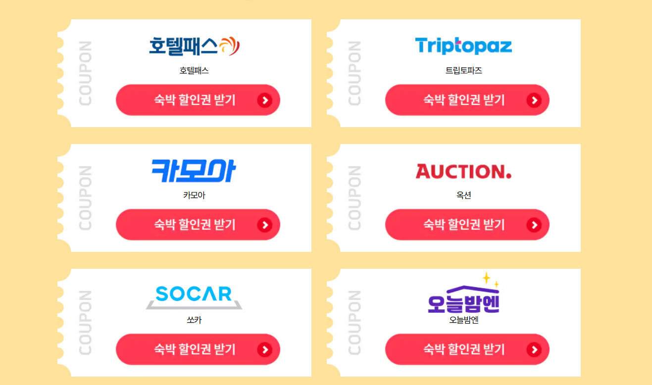 - 미등록 숙박시설 제외: 호텔, 리조트, 펜션 등 정식 등록된 숙박 시설에서만 할인권 사용이 가능합니다. 미등록 숙박 시설이나 대실 상품은 할인권 사용 대상에서 제외됩니다.
