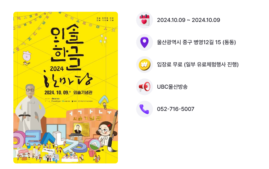 외솔한글한마당은 2024년 10월 9일(수) 한글날 울산 중구 외솔기념관에서 열리는 행사입니다.